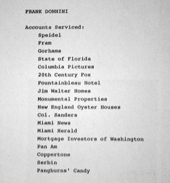 Frank Donnini’s Client List Tuesday, July 17th, 2012 at 2:29 pm Life, Promotional Materials Leave A Comment »